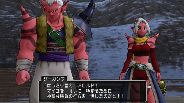 2018-02-10 メインクエ 1日め おわりと、はじまり。 ひとりのオーガ女性が命を落とすところから物語は始まります。(本当ならこの前にあるガチ始まりの物語についてはまた別の機会に)すでに事切れているものの、捨て置くには忍びないと村まで運んでくれるマイユさん。その時、何かが宿って「彼女」は目覚めます。雪深きランガーオ村。強さを重んじるオーガたち。村王の娘であるマイユさんと、その婚約者ジーガンフと2年振りに村へ戻ったという、ふたりの幼馴染のアロルド。不穏な予感が的中。ジーガンフを止めるため戦います。初のボス戦に勝利。しかしジーガンフは元に戻らず彼に付け入っていた真に悪しきもの悪鬼ゾンガロンが解き放たれてしまいます。これあかんやつ。ぉ→ぉ↑ぇ→ぇ↑ぁ→ぁ↑ぇ→ぇ↑ぉ↑ぉ↑ぉ↑ぉ→ぉ↑ぉ↓ぇ→ここでオープニングムービー。謎の光が、ゾンガロンを退けました。正気に戻ったジーガンフは、本来の人柄でマイユとアロルドを祝福大団円。世界に起こりつつある異変を知るため旅立つふたり。ジーガンフも修行の旅へ。オーガの「パズル」もまた、自身の目的のため旅立ちます。そして彼女も。つづく別種族なメインキャラで絡んだことはあったけどアロルドさん。思ったより主人公属性だった。ピーチ姫よばわりしててごめん。マイユさん。思ったより罪な女だった。ジーガンフさん、これは闇落ちしても仕方がないと思う。<クエストクリア>「ヤキトリじいさんの日常」「ランガーオ山地の黒い影」武闘家 Lv1→15